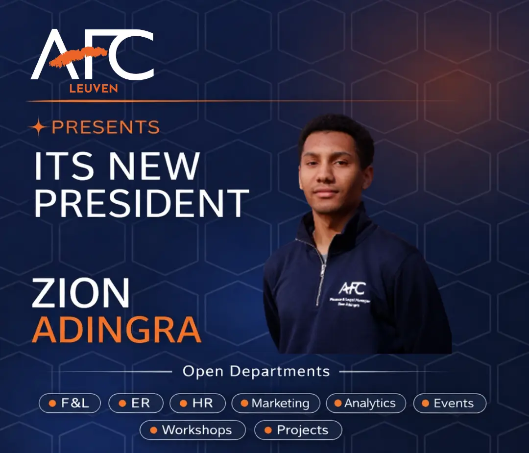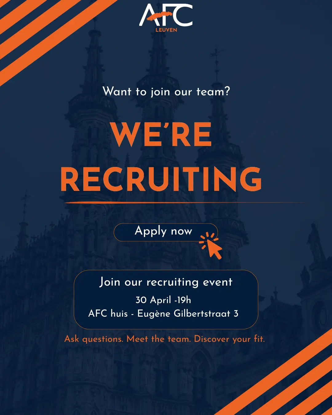 We're currently recruiting our 2026-2027 board for AFC Leuven. Are you willing to be part of a group of ambitious students that will lead AFC Leuven in 2026-2027? As part of our board, you will be one of our 8 managers responsible for their own departments and will lead a group of fellow ambitious students.
