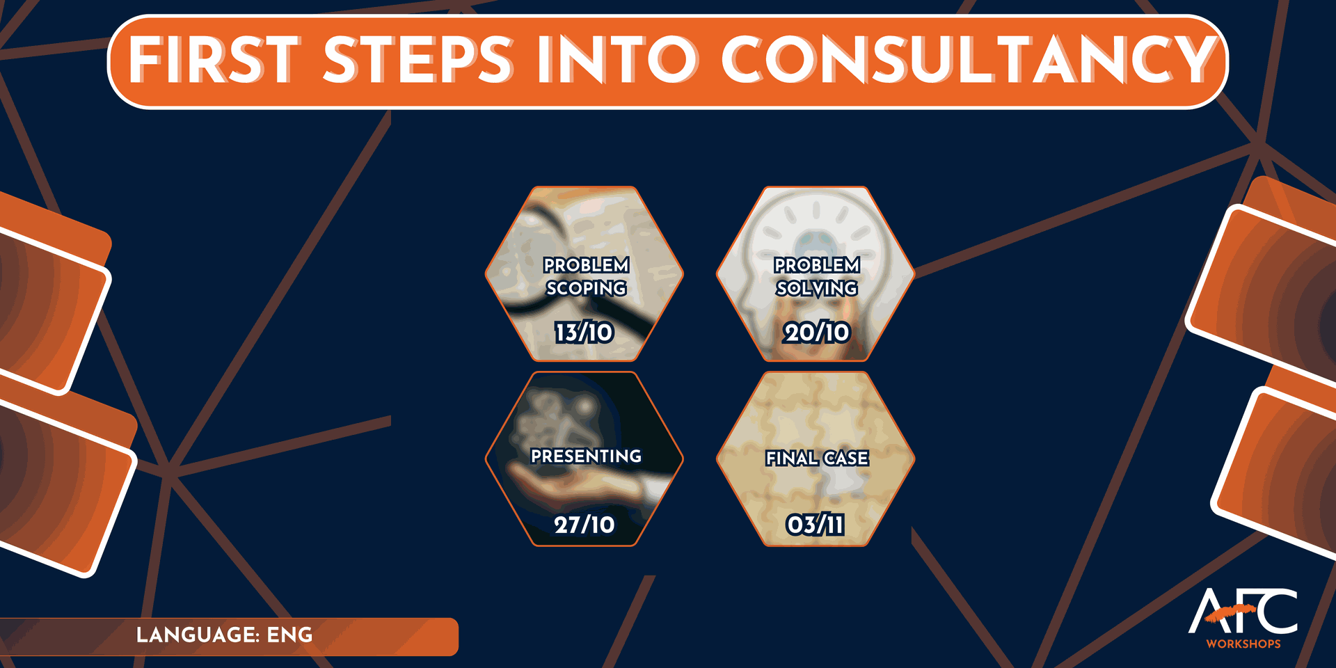 Discover "First Steps into Consulting," a comprehensive workshop track designed to equip participants with essential consulting skills. Over four engaging sessions, students will learn to effectively define problems, devise practical solutions, and confidently communicate recommendations. Each workshop offers hands-on experience, interactive discussions, and practical tools crucial for any aspiring consultants. By the end of this track, participants will possess foundational skills to tackle real-world consulting challenges and deliver impactful solutions.